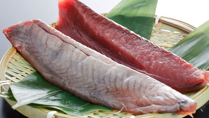 まぐろは体が大きく、部位ごとに味わいや食感が異なります。かつおはまぐろと比べると脂が少なく、さっぱりとした味わいで弾力があるのが特徴です。