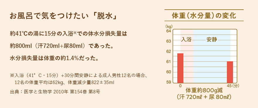 「お風呂」でもっとも気を付けたいのが脱水です。私たちの身体の60%は水分で、体重の3%の水分が失われると身体に変調をきたしてしまいます。個人差はありますが、10分程度の入浴でも失われる水分は数百ml。長湯をしたり温泉地で湯巡りをすれば、さらに大量の水分が失われます。知っておきたいのは、汗と一緒に塩分も失われること。