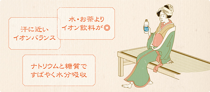 そうはいっても、「お風呂のあとにはビール」という方も多いでしょう。そこでオススメしたいのは、「入る前」の水分・イオン補給。すばやく水分を吸収させるには、①ナトリウムと糖質が入った②汗に近いイオンバランスの飲料が効率的。