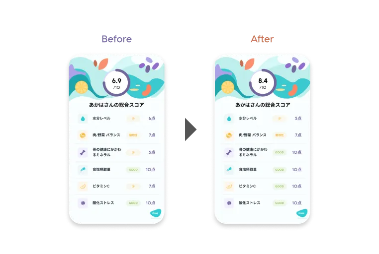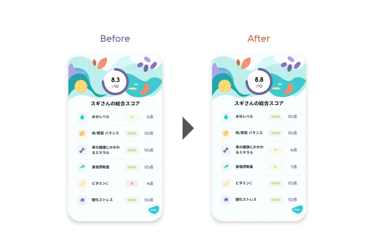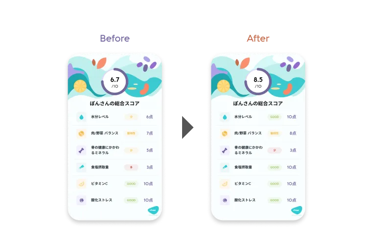 総合スコア6.5点から食生活を見直すことで8.5点までアップ