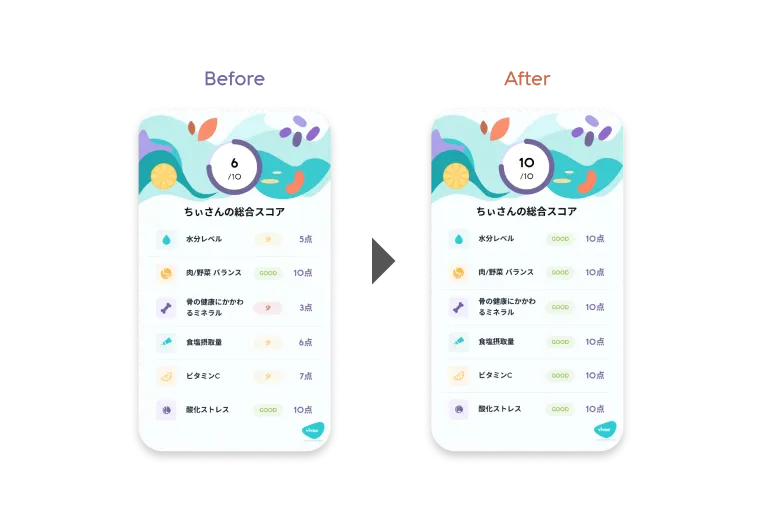 健康診断が年に1回しかないため、日頃の栄養状態などが気になりVivooを使い始めました。結構水分をとっていると思っていましたが、水分スコアが低かったため、いつもの水筒を500mlから750mlに変更したところ、スコアが改善しました。