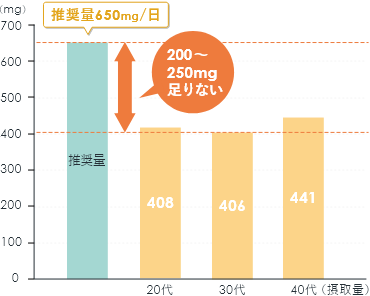 20〜40代女性は、あと200〜250mg足りないと言われています。トコエルなら、その不足分のカルシウムを補うことができます。