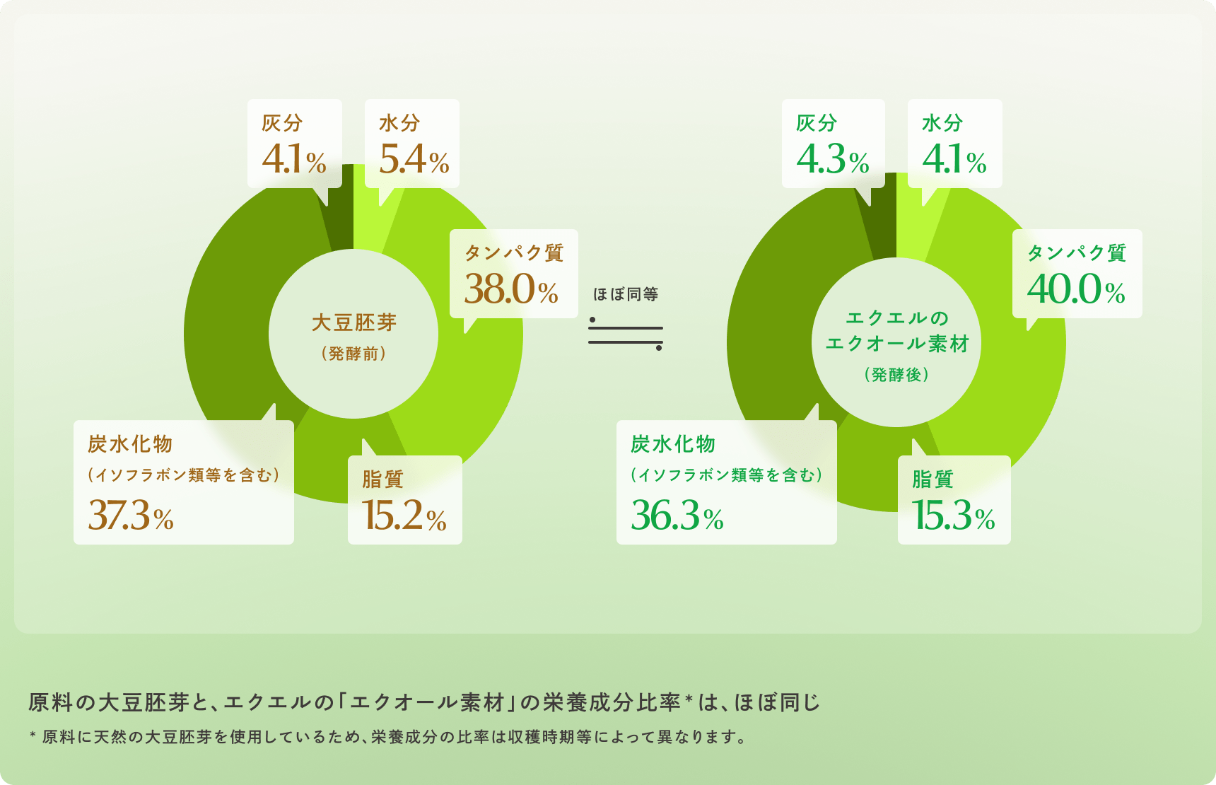 エクエルは、この大豆胚芽を乳酸菌で発酵させたままの「エクオール素材*」を使用することで、大豆胚芽の栄養成分がまるごと含まれています。