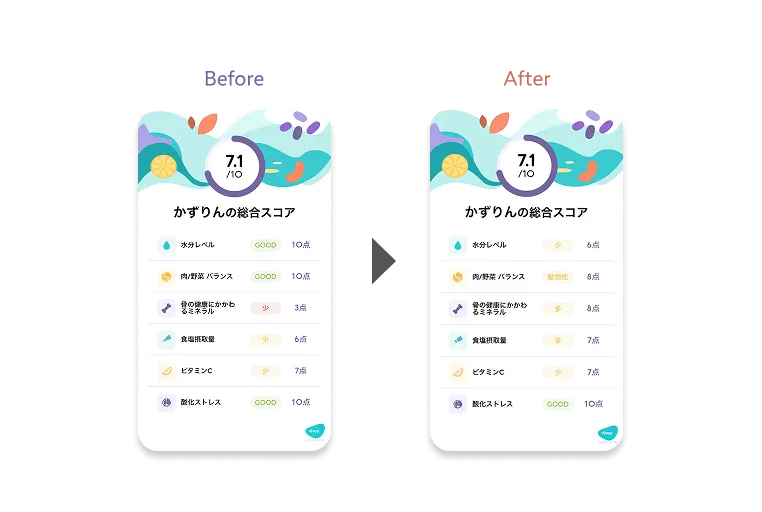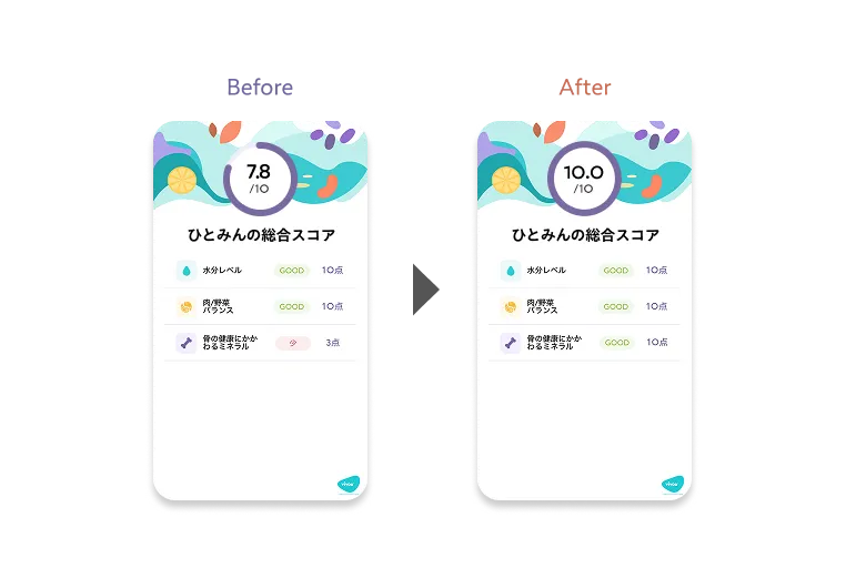 健康診断が年に1回しかないため、日頃の栄養状態などが気になりVivooを使い始めました。結構水分をとっていると思っていましたが、水分スコアが低かったため、いつもの水筒を500mlから750mlに変更したところ、スコアが改善しました。