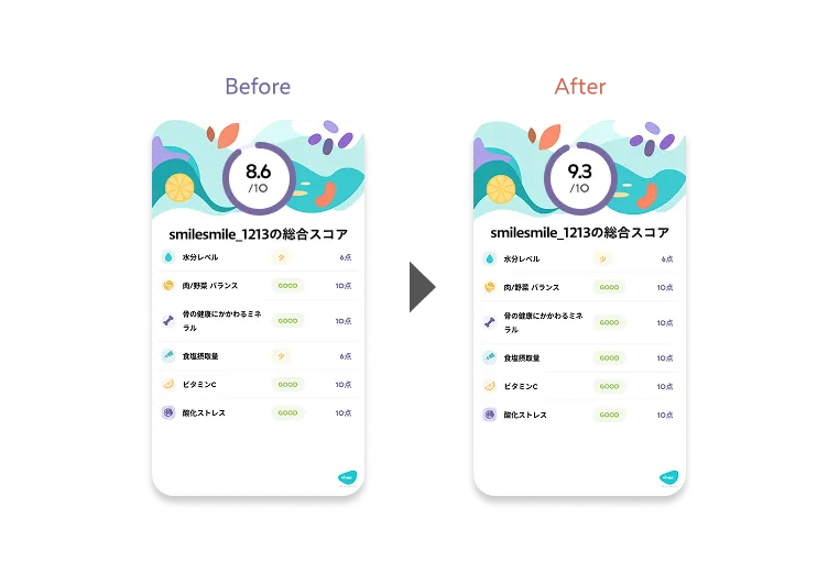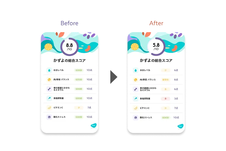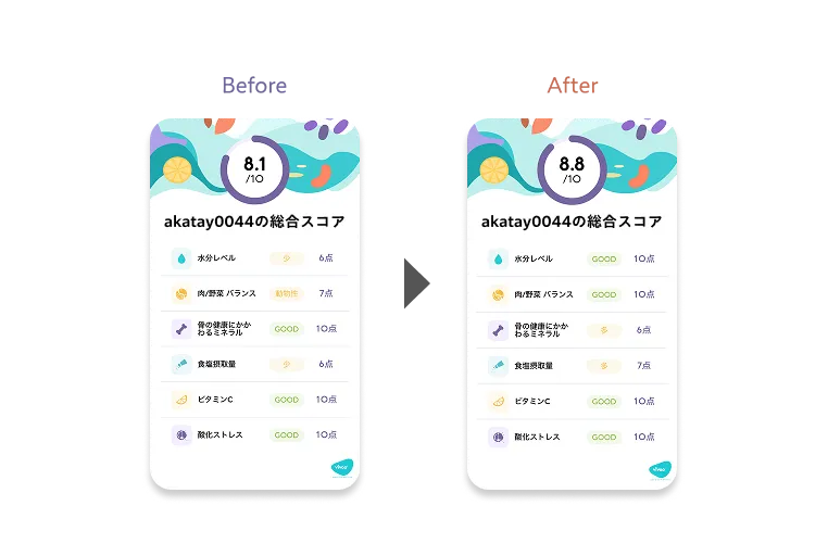 仕事が忙しくて普段の食事に気を使えないため、見直す良いきっかけになりました。初回のテスト結果で悪かった部分を意識して改善したところ、2回目ではその他の部分がマイナスになってしまいました。でも結果を意識して動いた結果なので満足です。ぼんやりと食生活は大事と言われてもなかなか動けませんが、スコアで表されると自然と頑張れました!